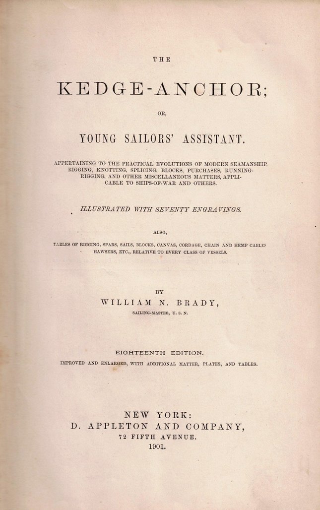 Kedge Anchor, The William N. BradyInstructional | Seamanship | Knotting & SplicingRecorded Editions: D. Appleton and Company, 1901Since changes to titles affect all users, modifications are moderated. Send change requests to the webmaster.
